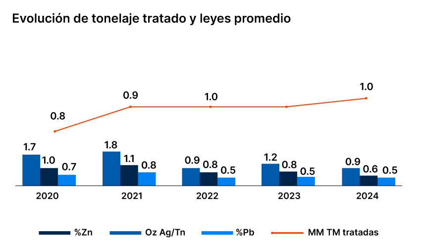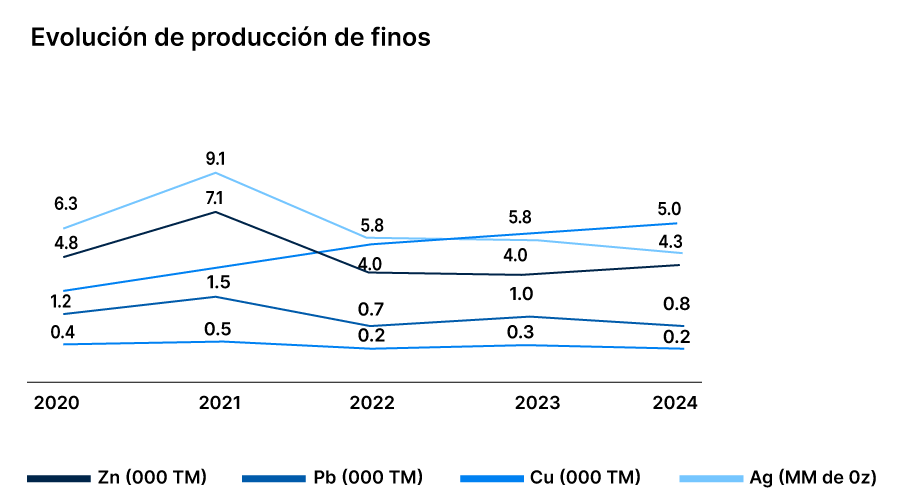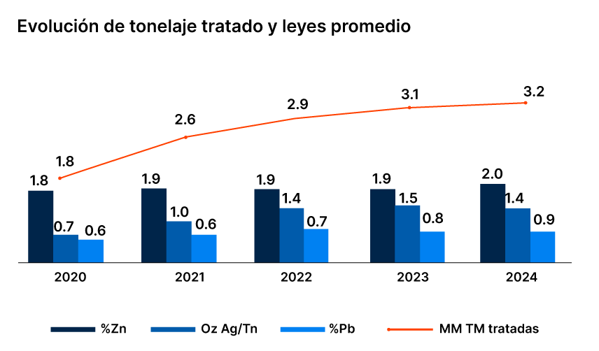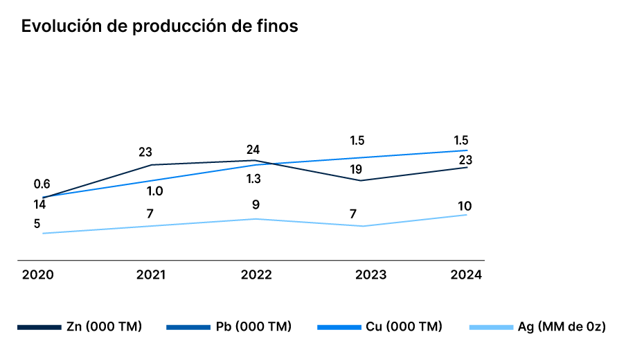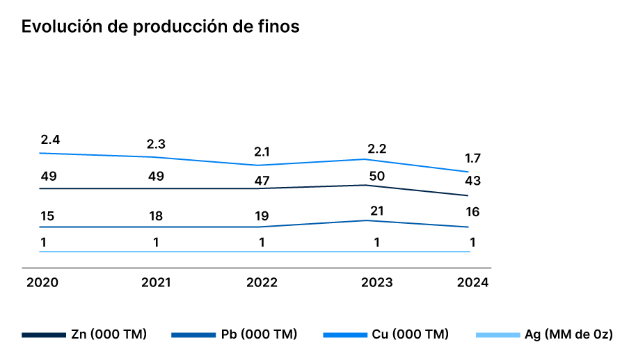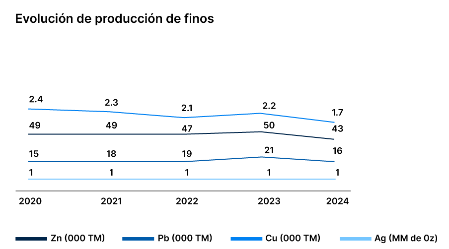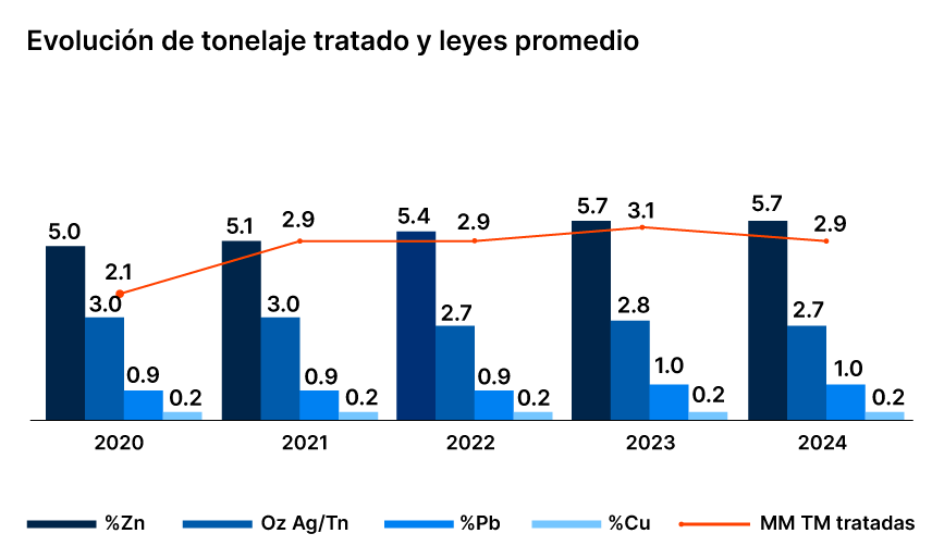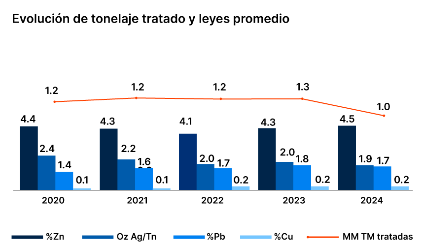 Actualmente operan cuatro minas subterráneas, dos tajos abiertos, cinco plantas concentradoras activas con una capacidad total de procesamiento de 26,150 TPD, una planta de lixiviación de 2,500 TPD (Óxidos) y una planta concentradora que se encuentra actualmente en condición de cuidado y mantenimiento (C&M).