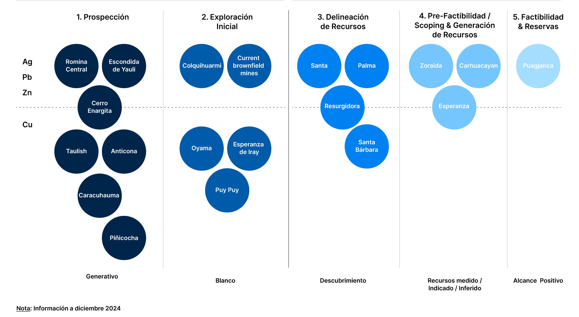 Volcan posee proyectos mineros polimetálicos que se encuentran en distintas etapas de exploración y constituyen una cartera robusta para el sostenimiento de sus operaciones y exploraciones para el corto, mediano y largo plazo.